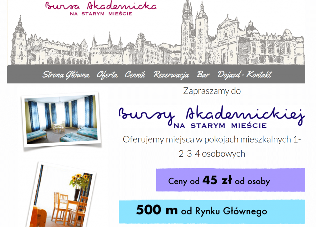 Strona Bursy Akademickiej przy placu Sikorskiego w Krakowie.